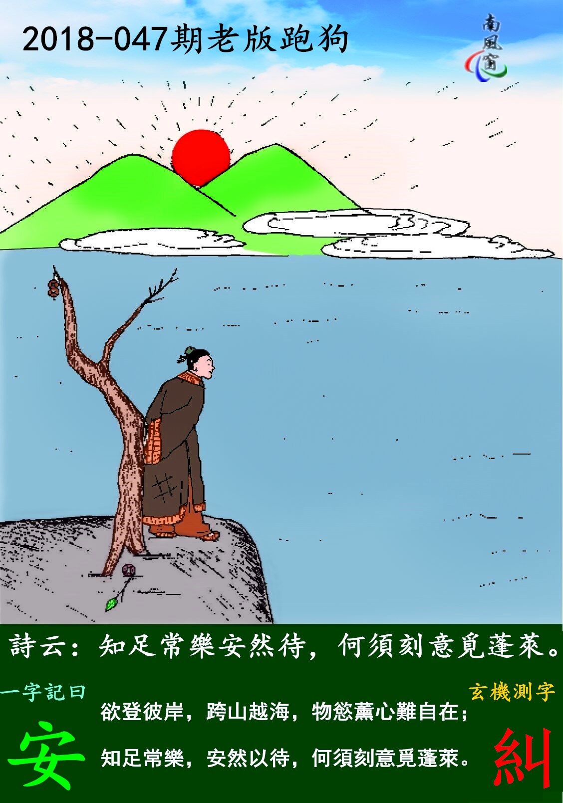 解这诗句有两层意思,上半段是说贪心,利欲熏心;第二段是教化人知足常乐,要知足!那么到底取贪心的还是知足的,那就要看回圖了,圖中一个男子,背后还有一棵树,树上和地上都有钱,但是男子却朝着大海的方向望去,说明了这个男子是不知足的,树上的钱和地上的铜钱根本无法满足他的欲望,可以看得出他是一个利欲熏心的人,他要去蓬莱找更多的钱,可以判断得出这个人很贪心,最贪心的莫过于蛇,其次是虎!一字之曰【安】,安字中带有女,取女肖,女肖之中最贪心蛇!