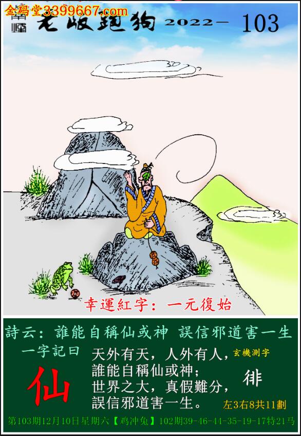 主题 : 103期老版跑狗一字記之曰:【仙】 玄機測字:《徘》
