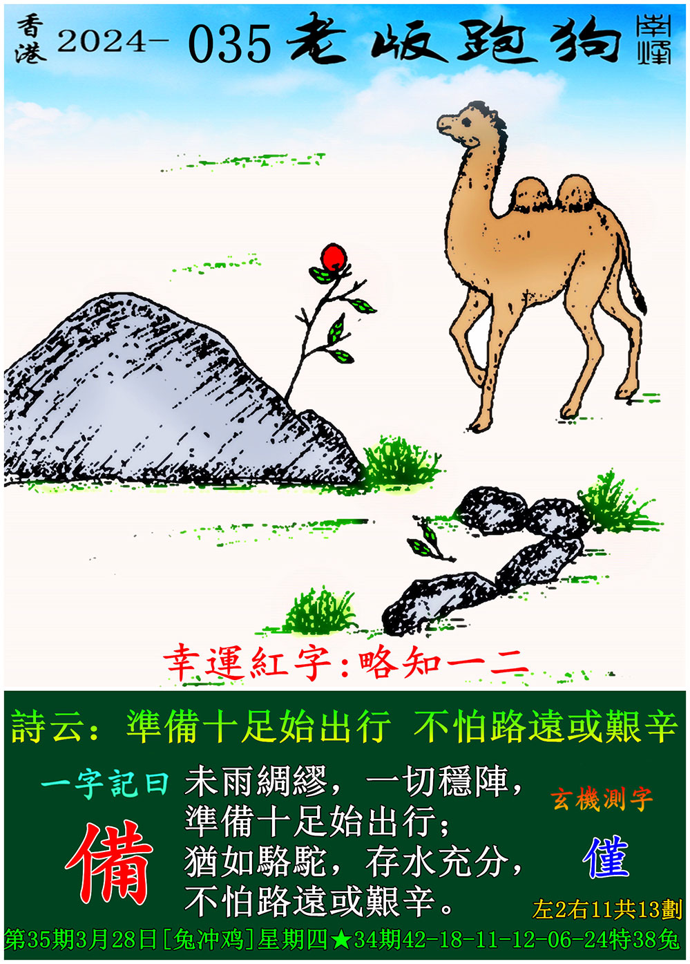 035期老版跑狗一字記之曰:【備】 玄機測字:《僅》