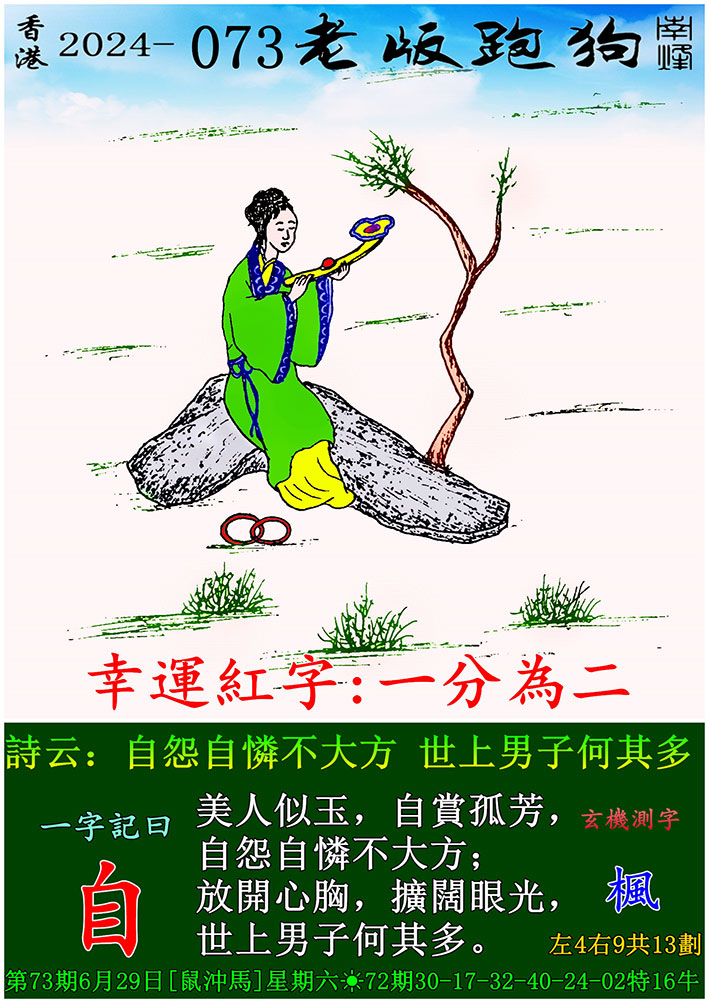 073期老版跑狗一字記之曰:【自】 玄機測字:《楓》