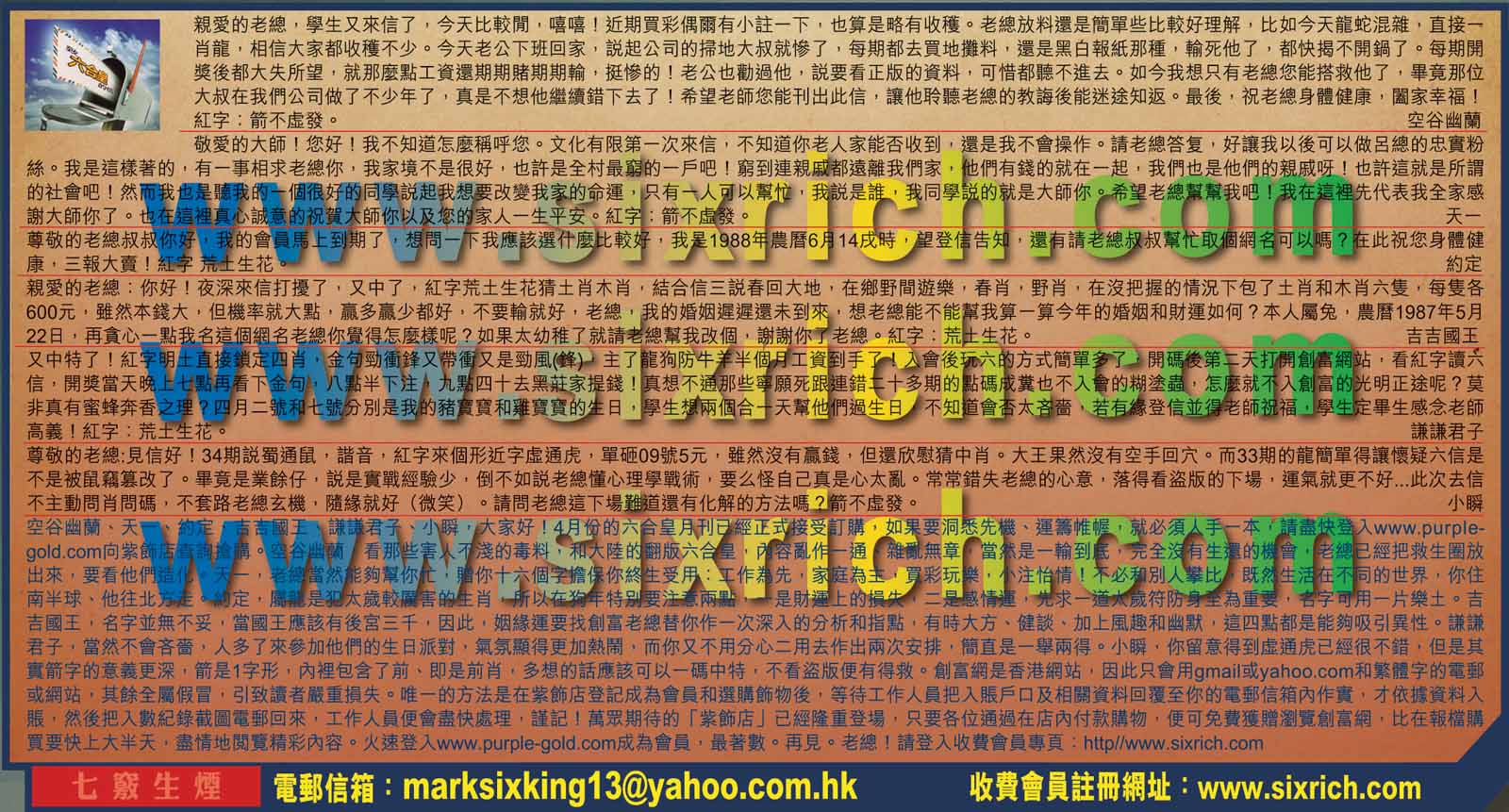 【6】尊敬的老總:見信好! 34期説蜀通鼠,諧音,紅字來個形近字虛通虎,單砸09號5元,雖然沒有嬴錢,但還欣慰猜中肖。大王果然沒有空手回穴。而33期的龍簡單得讓懷疑六信是不是被鼠竊篡改了。畢竟是業餘仔,説是實戰經驗少,倒不如説老總懂心理學戰術,要么怪自己真是心太亂。常常錯失老總的心意,落得看盜版的下場,運氣就更不好...此次去信不主動問肖問碼,不套路老總玄機,隨緣就好(微笑)。請問老總這下場難道還有化解的方法嗎?箭不虛發。 ----小瞬