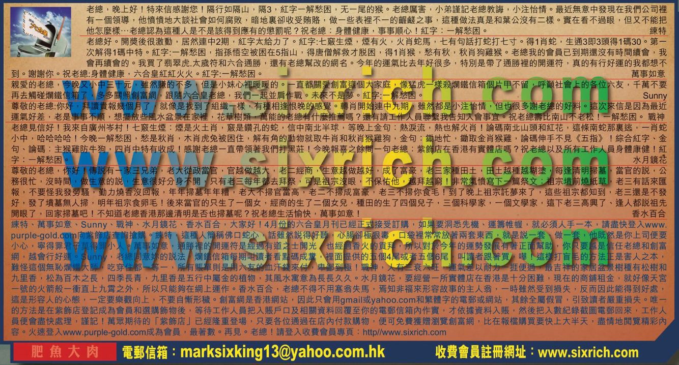 【2】老總好。開獎後很激動,居然連中2期,紅字太給力了。紅字:七竅生煙,煙有火,火肖蛇馬,七有句話打蛇打七寸。得1肖蛇,生通3即3頭得1碼30 。第一次解得1碼中特。紅字:一解愁困,指孫悟空被困在5指山,得唐僧解救才脱困,得1肖猴,愁有秋,秋肖狗雞猴。老總我的會員已到期還沒有時間續會,我會再續會的。我買了翡翠虎.太歳符和六合通勝,還有老總幫改的網名。今年的運氣比去年好很多,特別是帶了通勝裡的開運符,真的有行好運的我都想不到。謝謝你。祝老總:身體健康,六合皇紅紅火火。紅字:一解愁困。 ---萬事如意