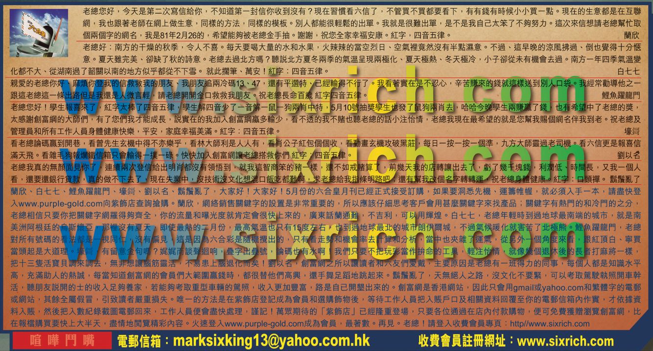 【1】老總您好,今天是第二次寫信給你,不知道第一封信你收到沒有?現在習慣看六信了,不管買不買都要看下,有有錢有時候小小買一點。現在的生意都是在互聯網,我也跟著老師在網上做生意,,同樣的方法,同樣的模板。別人都能很輕鬆的出單。我就是很難出單,是不是我自己太笨了不夠努力。這次來信想請老總幫忙取個兩個字的網名,我是81年2月26的,希望能夠被老總金手抽。謝謝,祝您全家幸福安康。紅字,四音五律。 ---蘭欣
