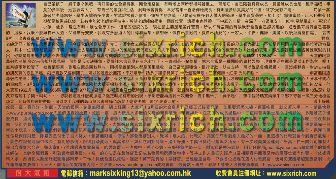 【5】尊敬的老總:多次來信都無緣見報,可能是我欠缺運氣,從關詿六信到現在有六七年了,一直都是小賭怡情,把六台當是一種閒時的農村娛樂,現實生活中還是要以工作為主,哎!無奈這兩年投資了一批養殖事業,到現在還是顆粒無收,同樣是養殖別人都是碩果豐收,自己卻沒那種命,銀行貸款,朋友支持,可以说是負債累累,一直沒能翻身,對於支持我的朋友真的很對不起,銀行貸款又要到期了,可以说是走投無路。不好意思,話多了讓您見笑了,祝:創富無限,三實健康。紅字:光彩四射。 ---創富無限遠