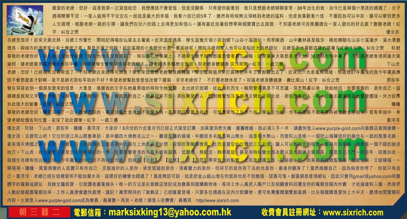 【3】.尊敬的老總你好,很久很久沒給你寫信了學生也很久沒有買彩了,現在專心於事業上,不過學生幾乎每期都還是會看看三大報,近來廣東天氣都是天天35-36度熱的快中暑了,不知道老總香港那邊天氣如何,請老總要多喝冷開水預防中暑。祝有時間學生會常來信和老總聊天,請老總多多賜教生意經。祝老總身體健康 笑口常開。紅字:一歲三遷 下山虎
