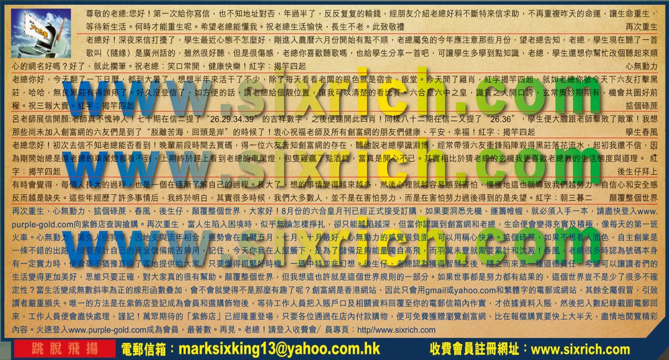 【4】.呂老師展信開顏:老師真不愧神人!七十期在信二提了“26.29.34.39”的吉祥數字,之後便連開此四肖!同樣八十二期在信二又提了“26.36”,學生便大膽跟老師擊敗了敵軍!我想那些尚未加入創富網的六友們是到了“脫離苦海,回頭是岸”的時候了!衷心祝福老師及所有創富網的朋友們健康、平安、幸福!紅字:揭竿四起 春風