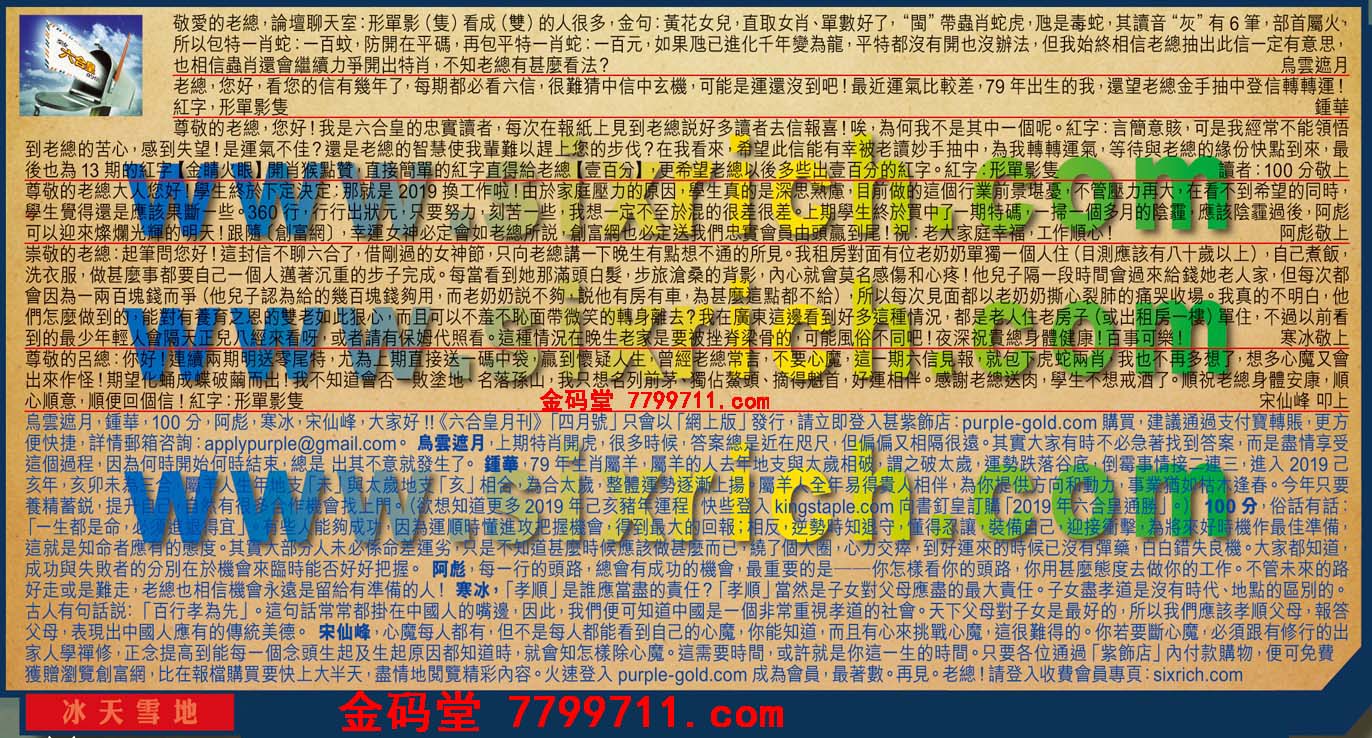 【2】老總,您好,看您的信有幾年了,每期都必看六信,很難猜中信中玄機,可能是運還沒到吧!最近運氣比較差,79年出生的我,還望老總金手抽中登信轉轉運!紅字形单影隻 ---鐘華