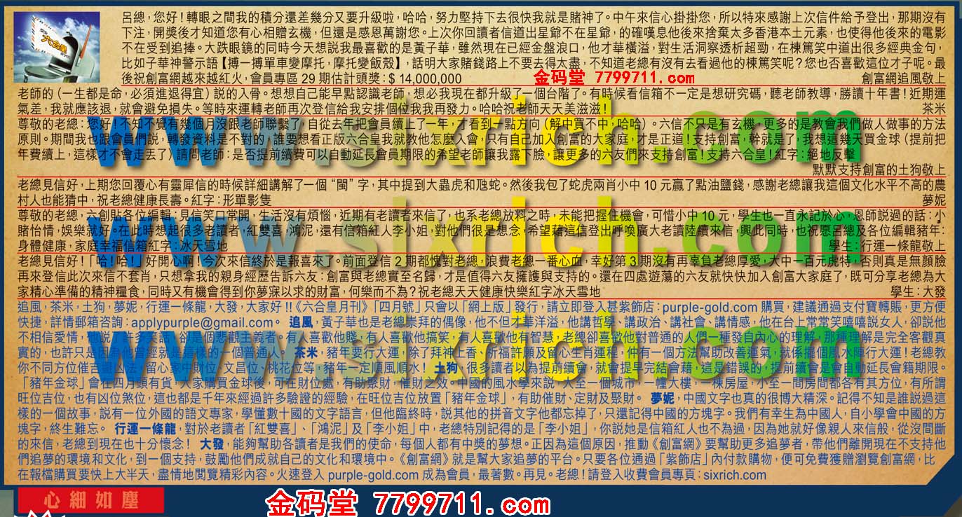 【1】呂總,您好!轉眼之間我的積分還差幾分又要升級啦,哈哈,努力堅持下去很快我就是賭神了。中午來信心掛掛您,所以特來感謝上次信件給予登出,那期沒有下注,開獎後才知道您有心相贈玄機,但還是感恩萬謝您。上次你回讀者信道出星爺不在星爺,的確嘆息他後來捨棄太多香港本土元素,也使得他後來的電影不在受到追捧。大跌眼镜的同時今天想說我最喜歡的是黃子華,雖然現在已經金盤浪口,他才華橫溢,對生活洞察透析超勁,在棟篤笑中道出很多經典金句,比如子華神警示語[搏一搏單車變摩托 ,摩托變飯殼],話明大家賭錢路上不要去得太盡,不知道老總有沒有去看過他的棟篤笑呢?您也否喜歡這位才子呢。最後祝創富網越來越紅火,會員專區29期估計頭獎:$ 14,000,000 ---創富網追風敬上