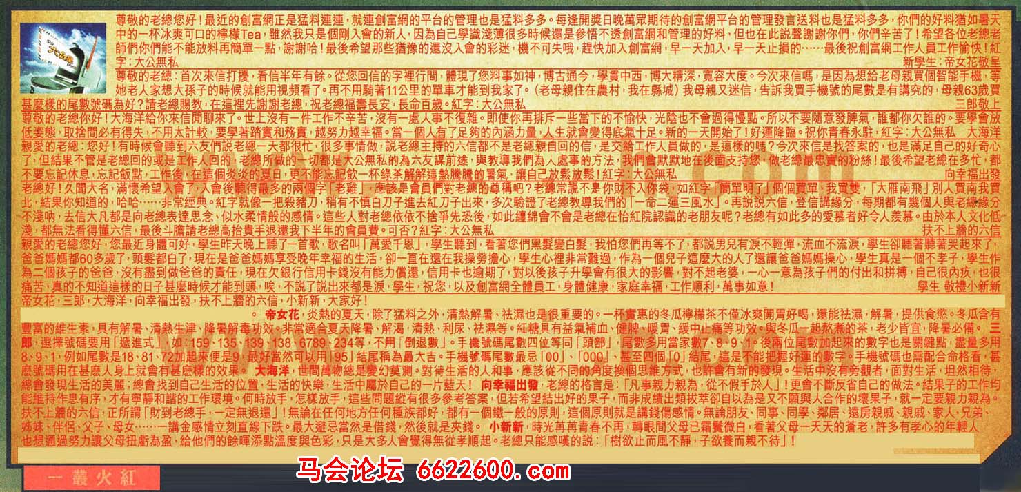 【5】老總好!久問大名,满偎希望入會了,人會後聽得最多的兩個字「老總」, 應該是會員們對老總的尊重吧?老總常說不是你財不入你帶,如紅字「簡單明了」個個實軍,我實雙,「大雁南飛」別人實南我實北結果你知道的,哈...非常經典。紅字就像一把殺豬刀,稍有不慎白刀子進去紅刀子出來,多次驗證了老總教導我們的「-命二運三風水」。再說說六信,登信講緣分,每期都有幾個人與老總緣分不浅呐, 去信大凡都是向老總表達思念、似水柔情般的感情。這些人對老總依依不捨爭先恐後,如此纏綿會不會是老總在怡紅院認識的老朋友呢?老總有如此多的爱慕者好令人羡慕。由於本人文化低淺,都無法看得懂六信,最後斗膽請老總高抬貴手退還我下半年的會員費。可否》紅字:大公無私---扶不上牆的六信