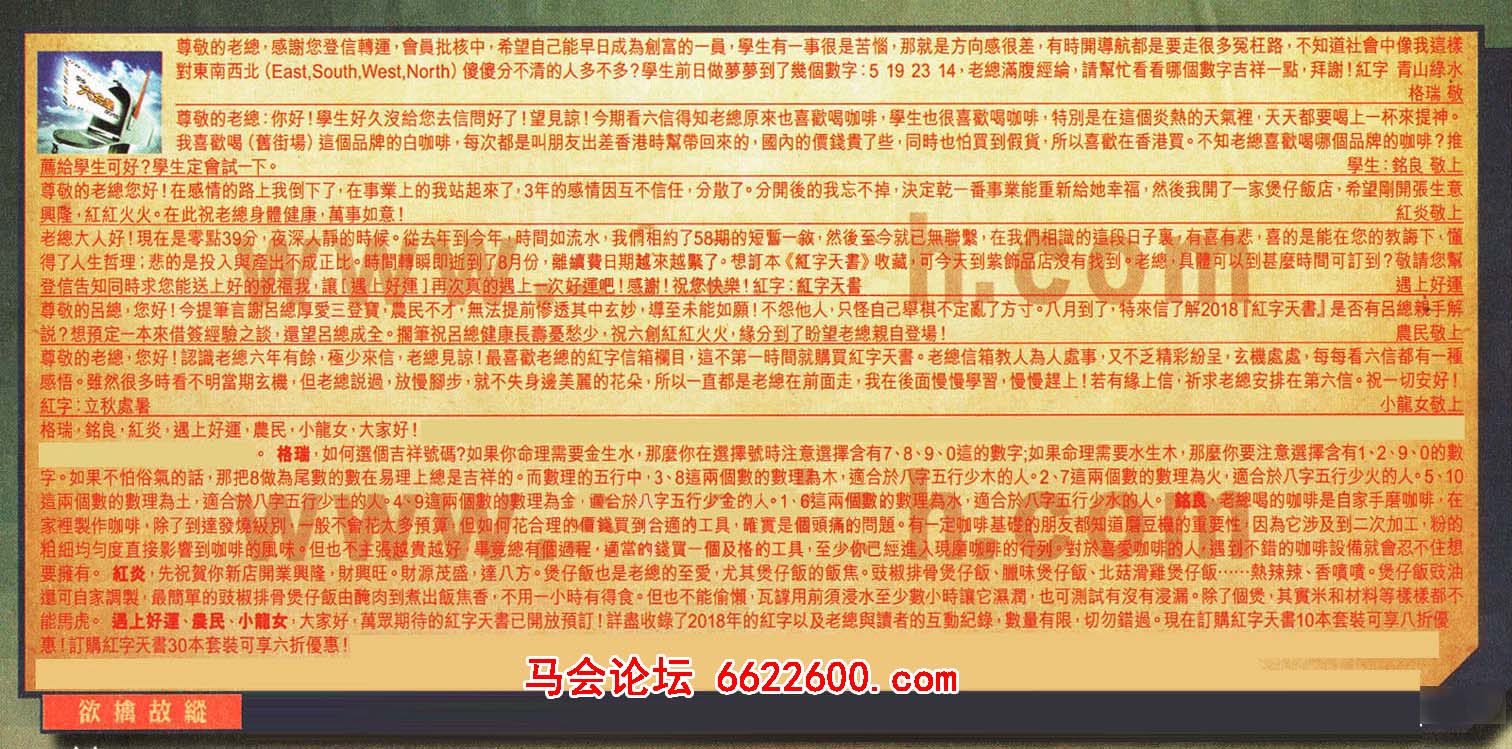 【5】尊敬的呂總,您好!今提筆言謝呂總厚愛三登寶,農民不才,無法提前惨透其中玄妙,導至未能如願!不怨他人,只怪自己舉棋不定亂了方寸。八月到了,特來信了解2018「紅字天書J是否有呂總親手解說?想預定一本來借簽經驗之談,還望呂總成全。擱筆祝呂總健康長壽憂愁少, 祝六創紅紅火火,缘分到了盼望老總親自登場! ---農民