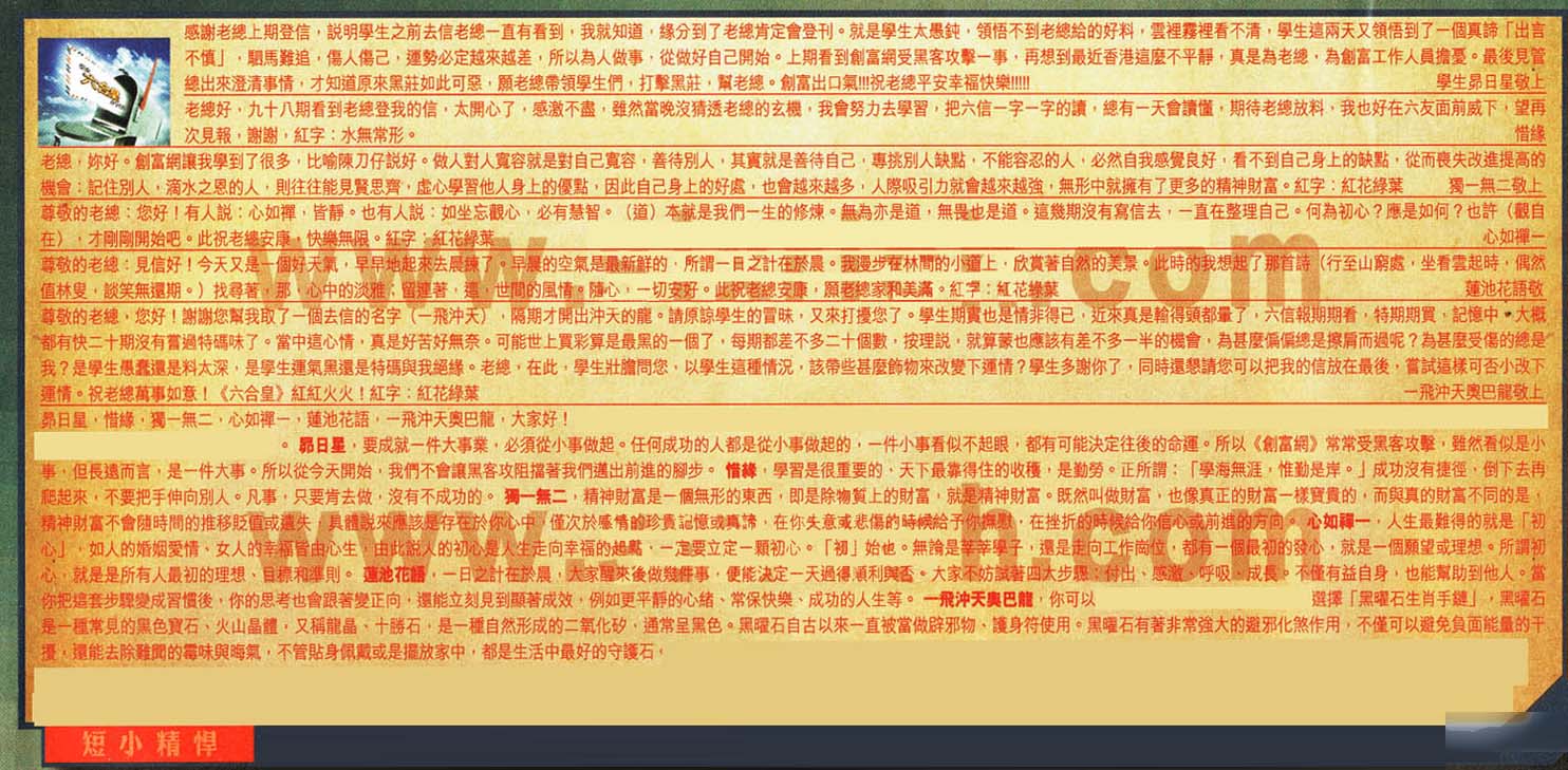 【2】老總好,九十八期看到老總登我的信,太開心了, 感激不盡,雖然當晚沒猜透老總的玄機,我會努力去學習,把六信一字一字的讀,继有一天會讀懂,期待老總放料 ,我也好在六友面前威下 ,望再次見報,謝谢,紅字:水無常形。---惜緣