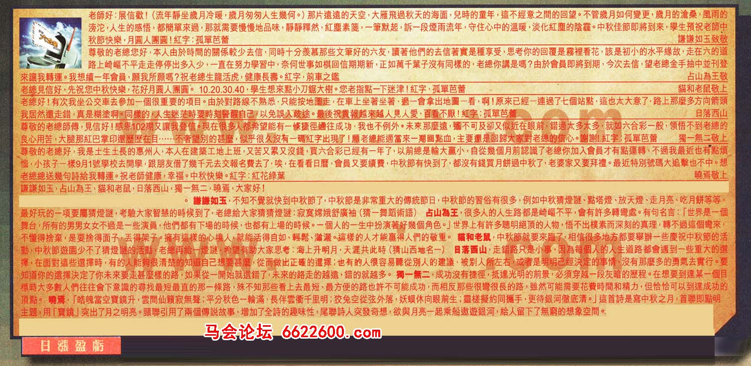 【6】.尊敬的老總好,我是土生土長的惠州人,本人在建築工地上班,又苦又累又沒錢,買六合彩已經有一年了,以前總是輸大贏小,自從幾個月前認識了老總你加入會員才有點運轉,不過我最近也有點煩惱,小孩子一樣9月1號學校去開學,跟朋友借了幾千元去交報名費去了,唉,在看看日曆,會員又要續費,中秋節有快到了,都沒有錢買月餅過中秋了,老婆家又要拜禮。最近特別號碼大追擊也不中。想老總總送幾句詩給我轉運。祝老師健康,幸福。中秋快樂。紅字:紅花綠葉    曉焉敬上