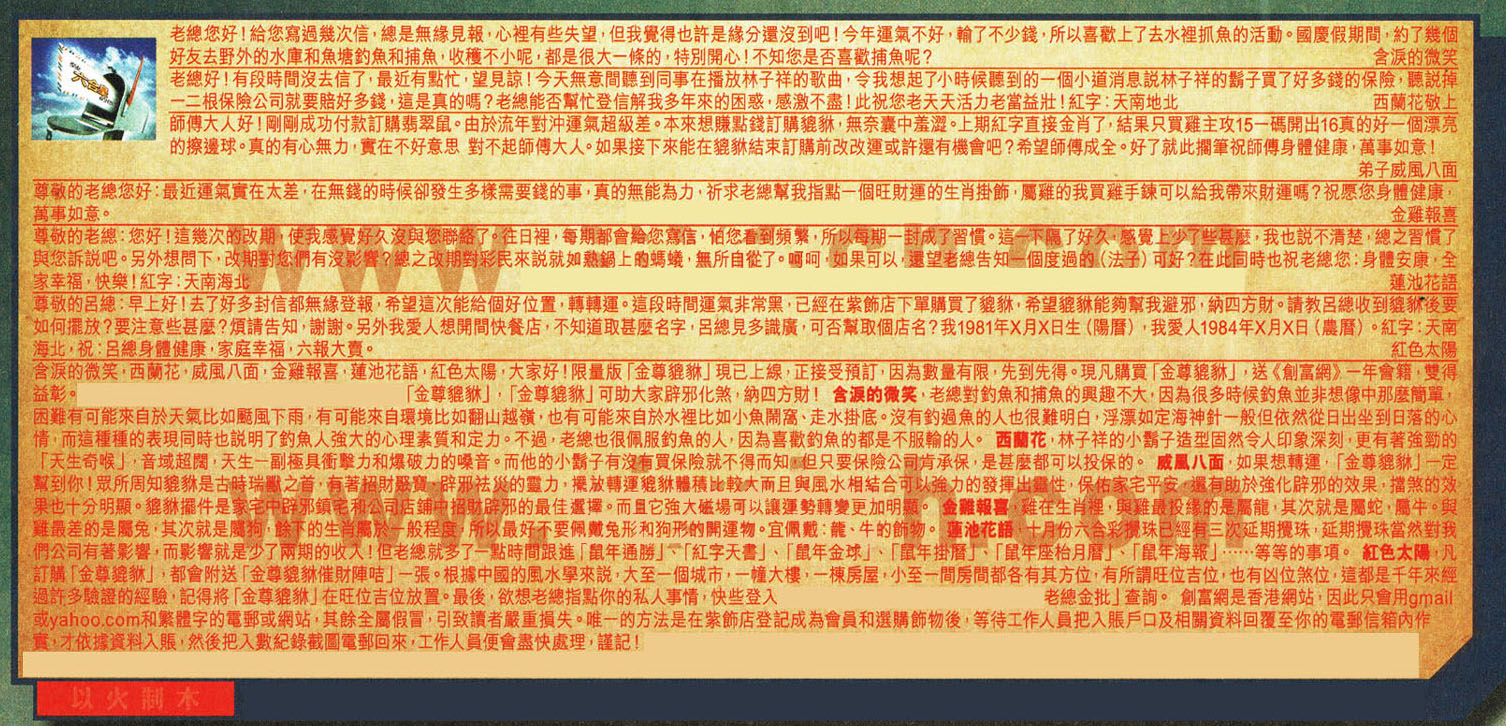 【6】尊敬的呂總:早上好!去了好多封信都無緣登報,希望這次能給個好位置,轉轉運。這段時間運氣非常黑,已經在紫飾店下單購買了貔貅,希望貔貅能夠幫我避邪,納四方財。請教呂總收到貔貅後要如何擺放?要注意些甚麼?煩請告知,謝謝。另外我愛人想開間快餐店,不知道取甚麼名字,呂總見多識廣,可否幫取個店名?我1981年X月X日生(陽曆),我愛人1984年X月X日(農曆)。紅字:天南海北,祝:呂總身體健康,家庭幸福,六報大賣。    紅色太陽