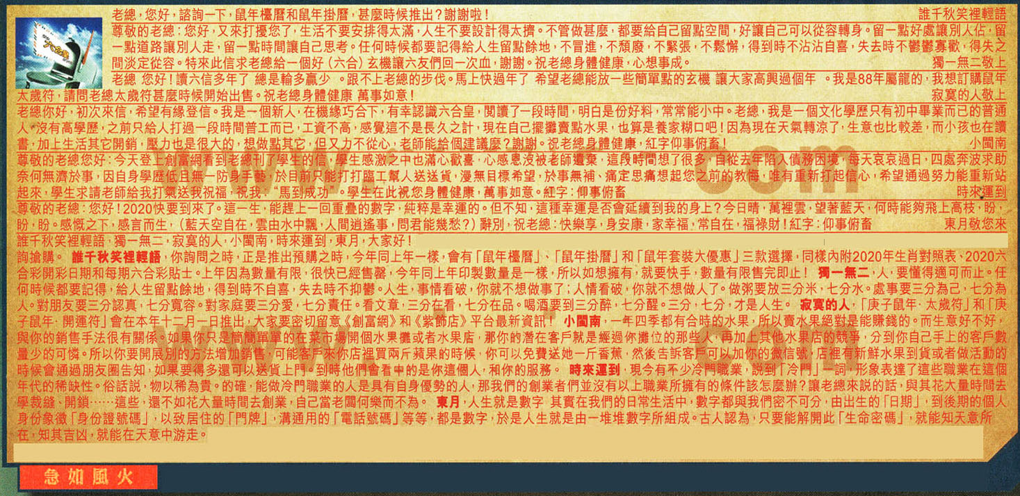 【3】.老總 您好!讀六信多年了 總是輸多贏少 。跟不上老總的步伐。馬上快過年了 希望老總能放一些簡單點的玄機 讓大家高興過個年 。我是88年屬龍的,我想訂購鼠年太歲符,請問老總太歲符甚麼時候開始出售。祝老總身體健康 萬事如意! 寂寞的人敬上