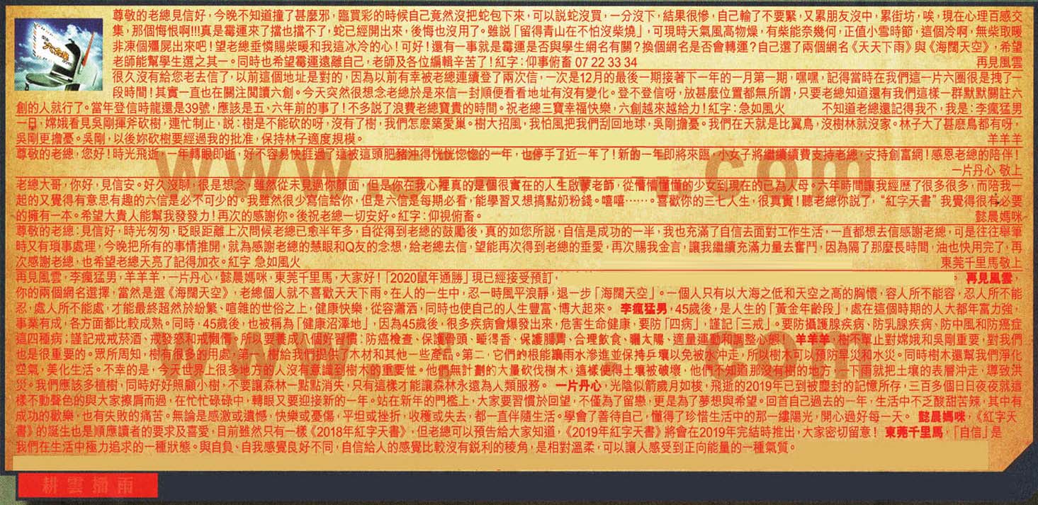 【1】尊敬的老總見信好,今晚不知道撞了甚麼邪,臨買彩的時候自己竟然沒把蛇包下來,可以說蛇沒買:-分沒下,結果很慘,自己輸了不要緊,又累朋友沒中,累街坊唉,現在心理百感交集,那個侮恨啊!!真是霉運來了擋也擋不了,蛇已經開出來,後悔也沒用了。雖說「留得青山在不怕沒柴燒」,可現時天氣風高物燥有柴能奈幾何,正值小雪時節,這個冷啊,無柴取暖非凍個缰屍出來吧!望老總垂憐賜柴暖和我這冰冷的心!可好!還有一事就是霉運是否與學生網名有關?換個網名是否會轉運?自己選了兩個網名《天天下雨與《海闊天空》,希望老師能幫學生選之其一。同時也希望霉運遠離自己,老師及各位編輯辛苦了!紅字:仰事俯畜07 22 33 34-----再見風雲