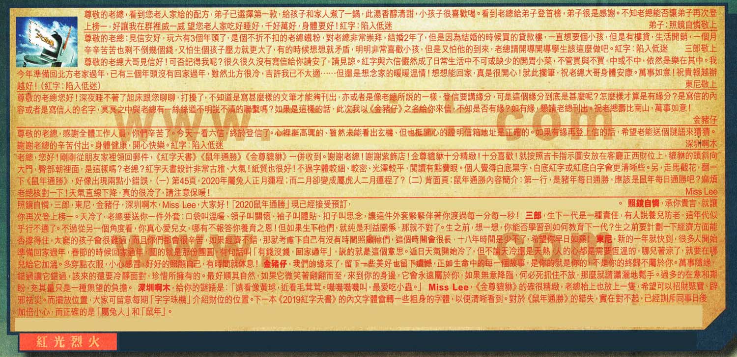 【3】.尊敬的老總大哥見信好!可否記得我呢?很久很久沒有寫信給你請安了,請見諒。紅字與六信儼然成了日常生活中不可或缺少的開胃小菜,不管買與不買,中或不中,依然是樂在其中。我今年準備回北方老家過年,已有三個年頭沒有回家過年,雖然北方很冷,吉許我已不太適……但還是想念家的暖暖溫情!想想能回家,真是很開心!就此擱筆,祝老總大哥身體安康。萬事如意!祝貴報越辦越好!(紅字:陷入低迷) 東尼敬上