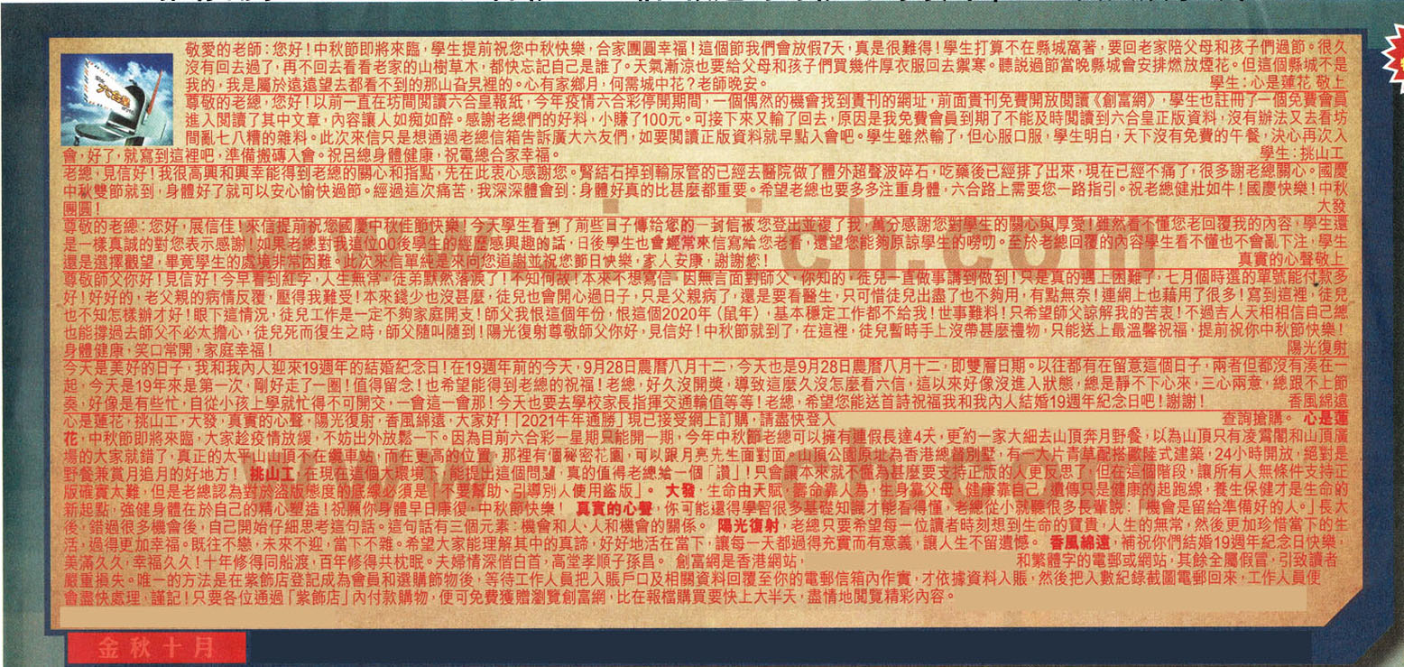 【4】尊敬的老總:您好,展信佳!来信提前祝您國慶中秋佳節快樂!今天學生看到了前些日子博给您的封信被您登出並複了我,萬分感谢您对學生的關心與厚爱!虽然看不懂您老回覆我的内容、學生還是一樣真誠的對您表示感謝!如果老總對我這位00後學生的經歷感興趣的話,日後学生也會经常来信寫給您老看,還望您能夠原諒學生的嘮叨。至於老總回覆的内容學生看不懂也不會亂下注,學生還是選擇觀望,畢竟學生的處境非常困難。此次來信單純是来向您道謝並祝您節日快樂,家人安康:謝謝您! ---真實的心聲敬上