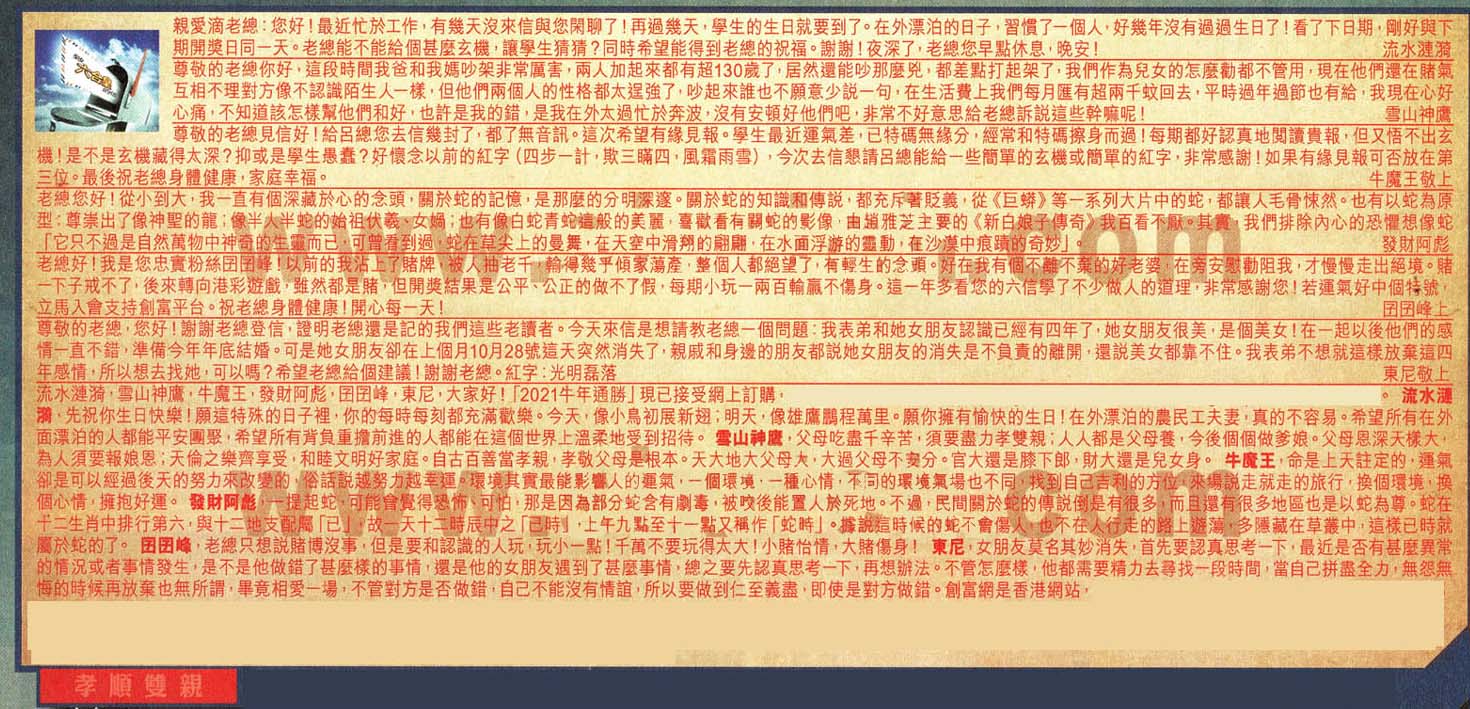 【3】.尊敬的老總見信好!給呂總您去信幾封了,都了無音訊。這次希望有緣見報。學生最近運氣差,已特碼無緣分,經常和特碼擦身而過!每期都好認真地閱讀貴報,但又悟不出玄機!是不是玄機藏得太深?抑或是學生愚蠢?好懷念以前的紅字(四步一計,欺三滿四,風霜雨雪),今次去信懇請呂總能給一些簡單的玄機或簡單的紅字,非常感謝!如果有緣見報可否放在第三位。最後祝老總身體健康,家庭幸福。 牛魔王敬上