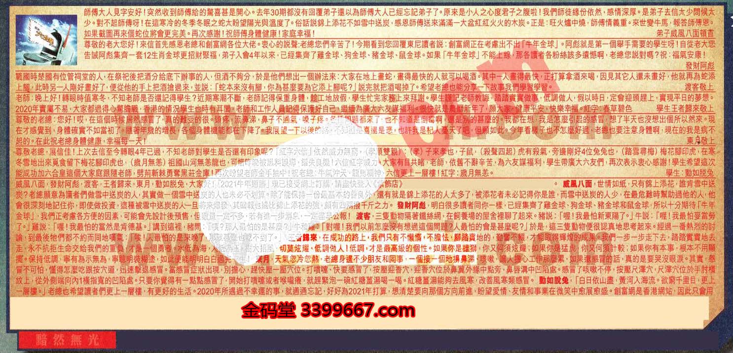 【6】.尊敬老總,展信佳!上次去信至今轉眼4年已過,不知老師對學生是否還有印象呢?「紅字六信」依然威力無窮,(孝順雙親): (孝)子來孝也,子鼠,(殺聲四起)虎有殺氣,旁邊剛好4位兔兔也,(踏雪尋梅)梅花腳印虎,在寒冬雪地出來覓食留下梅花腳印虎也,(歲月無恙)祖國山河無恙龍也,可惜昨晚被黑料誤導,錯失良機!六信紅字威力,大家有目共睹,老師,依舊不辭辛苦,為六友謀福利,學生帶廣大六友們,再次表示衷心感謝!學生希望這次能成功加六合皇這個大家庭跟隨老師,劈荊斬棘勇奪黑莊金庫!再次盼望老師金手抽中!祝老總:牛氣沖天、龍馬精神,六信更上一層樓!紅字:歲月無恙。  學生:動如脱兔