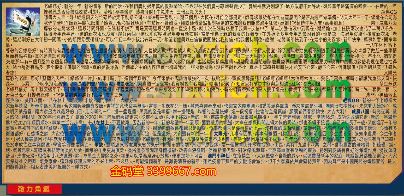 【6】.老總見信好,馬上就要過年了,你們香港過年跟我們這邊一樣喜慶嗎?現在過年愈來愈沒勁了不知道何時才能找到小時的感覺不知道?是人變了還是社會變了?現在的人都是(八面玲瓏)嘴上說一套做一套,哎天色已晚不打擾老總你了。祝創富網越辦越好!紅字:震木之象 澳門小神仙敬上