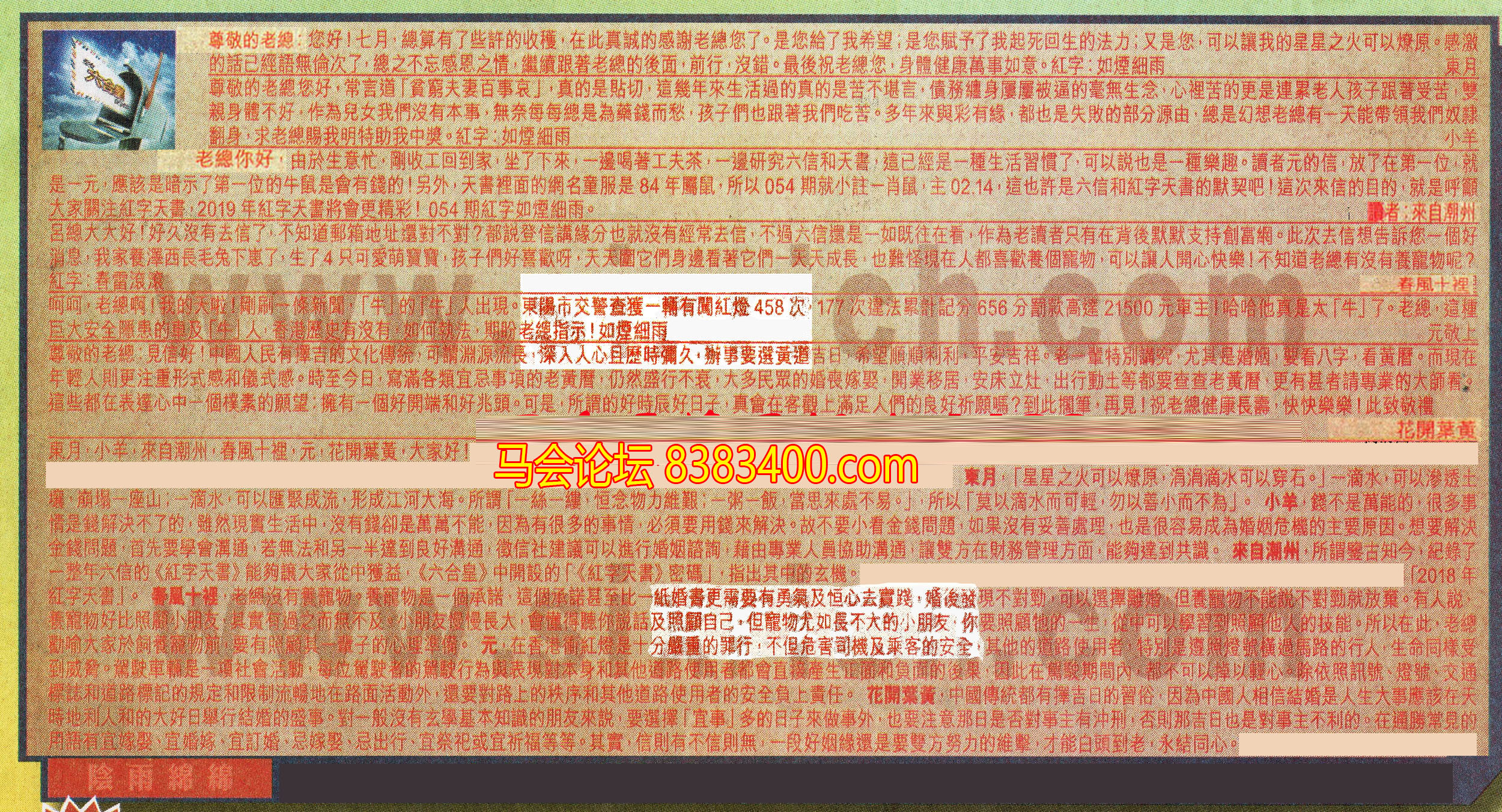 【3】.老總你好,由於生意忙,剛收工回到家,坐了下來,一邊喝著工夫茶,一邊研究六信和天書,這已經是一種生活習慣了,可以說也是一種樂趣。讀者元的信,放了在第一位,就是一元,應該是暗示了第一位的牛鼠是會有錢的!另外,天書裡面的網名童服是84年屬鼠,所以054期就小註一肖鼠,主02.14,這也許是六信和紅字天書的默契吧!這次來信的目的,就是呼籲大家關注紅字天書,2019年紅字天書將會更精彩!054期紅字如煙細雨。 讀者:來自潮州