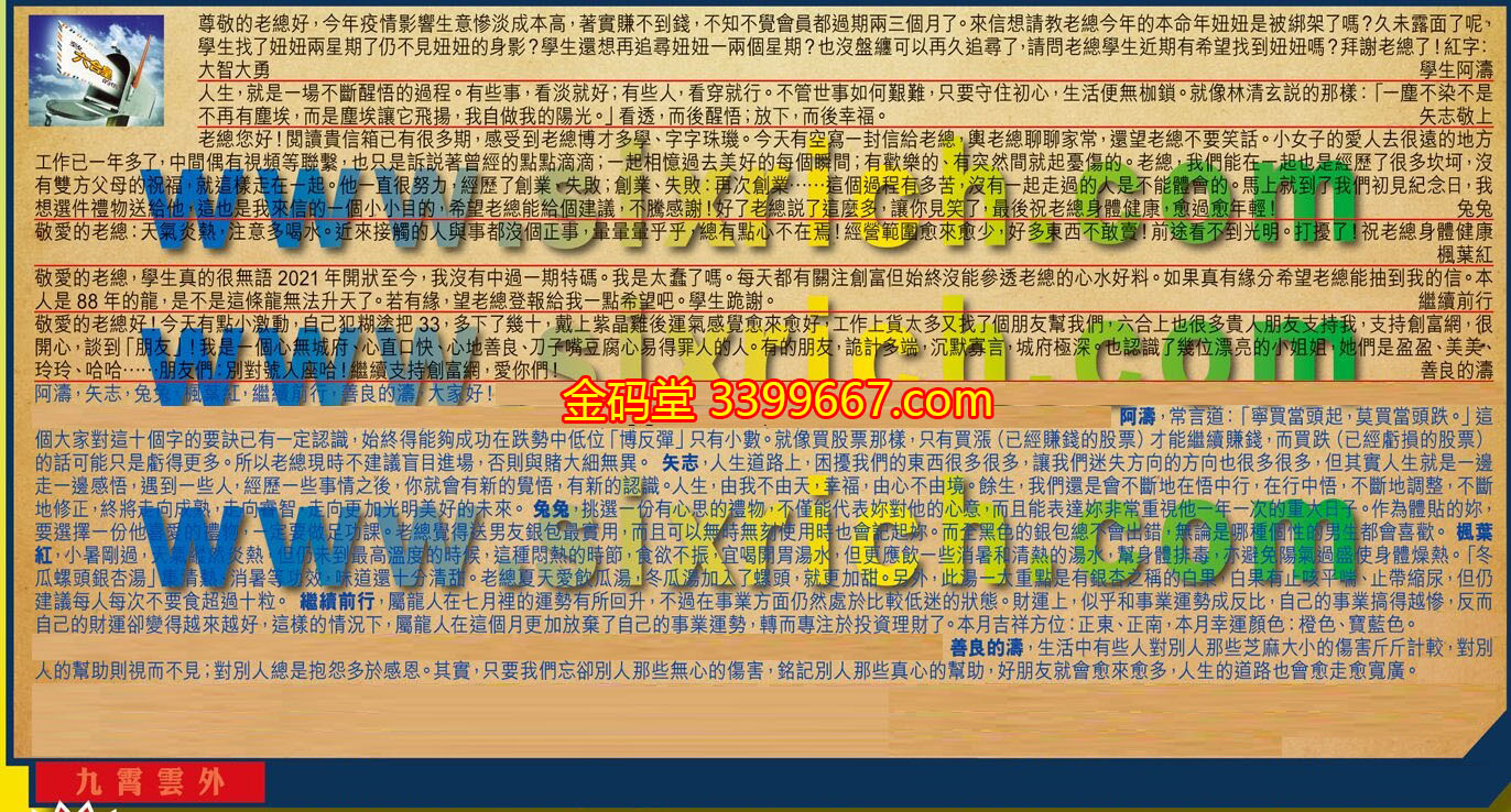 【5】.敬愛的老總,學生真的很無語2021年開狀至今,我沒有中過一期特碼。我是太蠢了嗎。每天都有關注創富但始終沒能參透老總的心水好料。如果真有緣分希望老總能抽到我的信。本人是88年的龍,是不是這條龍無法升天了。若有緣,望老總登報給我一點希望吧。學生跪謝。  繼續前行