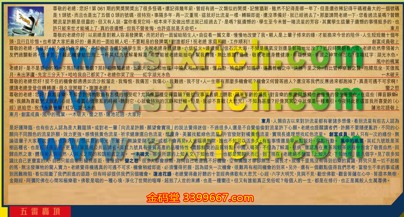 【1】.尊敬的老總:您好!第061期的開獎開獎出了很多怪碼。還記得幾年前,曾經有過一次類似的開獎,記憶猶新,雖然不記得是哪一年了,但是還依稀記得平碼裡最大的一個號碼是1頭號,而且也是出了五個0頭的號碼,很特別。事隔多年,再一次重現,這就好比流星一樣,轉瞬即逝,還沒準備好,就已經過去了。那麼請問老總一下,您看過流星嗎?曾聽聞流星許願是很靈的,但又有人說,當你看見它時,根本來不及做出想法就已經過去了,是嗎?挺遺憾的,學生至今未曾一睹流星的芳容,其實學生這輩子遺憾的事情挺多的,也許只能來世才能補上了,真的很遺憾,但我不曾後悔,也許這就是天命吧。 東月