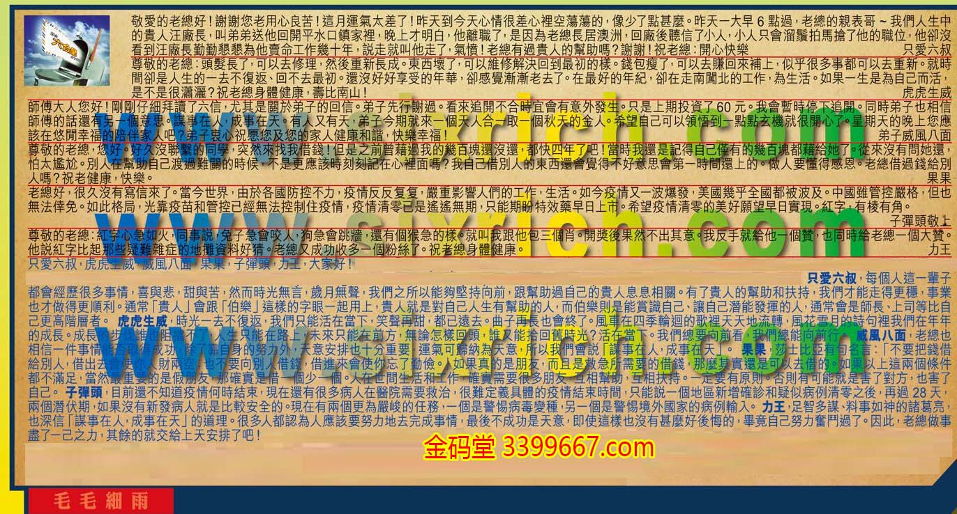 【5】.老總好,很久沒有寫信來了。當今世界,由於各國防控不力,疫情反反复复,嚴重影響人們的工作,生活。如今疫情又一波爆發,美國幾乎全國都被波及。中國雖管控嚴格,但也無法倖免。如此格局,光靠疫苗和管控已經無法控制住疫情,疫情清零已是遙遙無期,只能期盼特效藥早日上市。希望疫情清零的美好願望早日實現。紅字,有棱有角。  子彈頭敬上