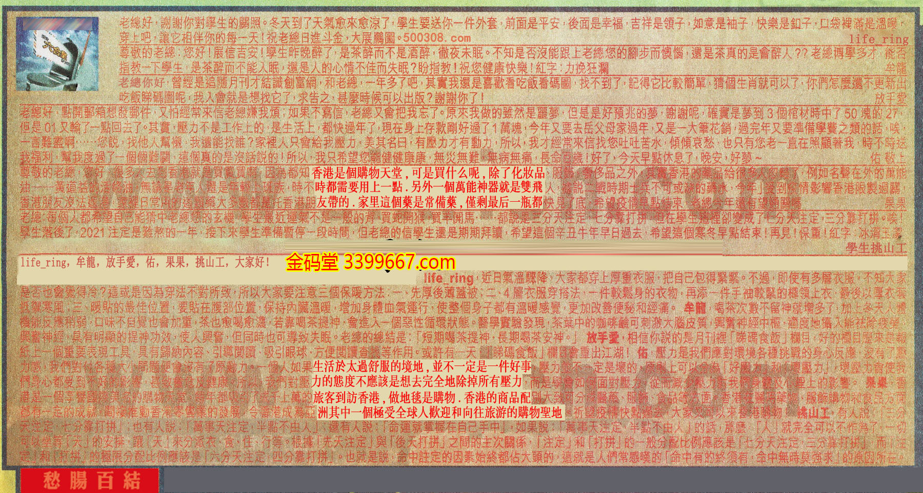 【6】.老總:每個人都希望自己能猜中老總您的玄機,學生最近運氣不是一般的背,買蛇開猴,買羊開馬......都説是三分天注定,七分靠打拼,但在學生這裡卻變成了七分天注定,三分靠打拼。唉!學生落後了,2021注定是難熬的一年,接下來學生準備暫停一段時間,但老總的信學生還是期期拜讀,希望這個辛丑牛年早日過去,希望這個寒冬早點結束!再見!保重!紅字:冰清玉潔 學生:挑山工