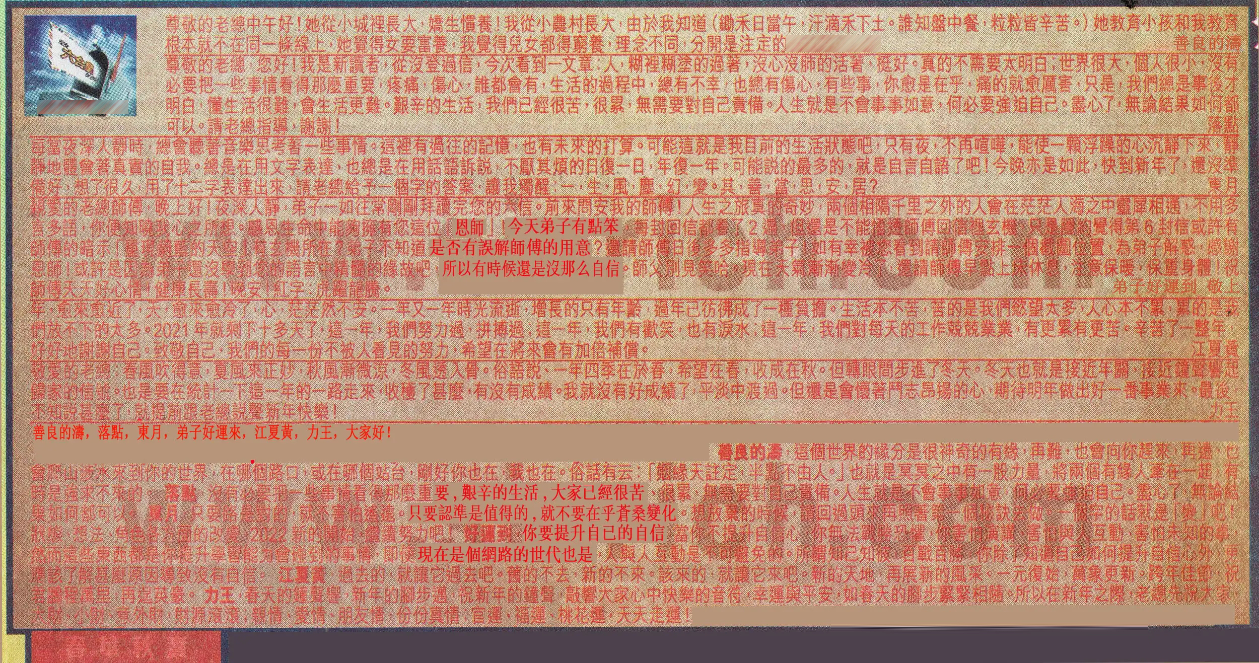 【4】. 親愛的老總師傅,晚上好!夜深人靜,弟子一如往常剛剛拜讀完您的六信。前來問安我的師傅!人生之旅真的奇妙,兩個相隔千里之外的人會在茫茫人海之中靈犀相通,不用多言多語,你便知曉我心之所想。感恩生命中能夠擁有您這位「恩師」!今天弟子有點笨,每封回信都看了2遍,但還是不能悟透師傅回信裡玄機,只是隱約覺得第6封信或許有師傅的暗示「重現蔚藍的天空」有玄機所在?弟子不知道是否有誤解師傅的用意?還請師傅日後多多指導弟子!如有幸被您看到請師傅安排一個截圖位置,為弟子解惑,感謝恩師!或許是因爲弟子還沒學到您的語言中精髓的緣故吧,所以有時候還是沒那麽自信。師父別見笑哈。現在天氣漸漸變冷了,還請師傅早點上床休息,注意保暖,保重身體!祝師傅天天好心情!健康長壽!晚安!紅字:虎躍龍騰。 弟子 好運到 敬上