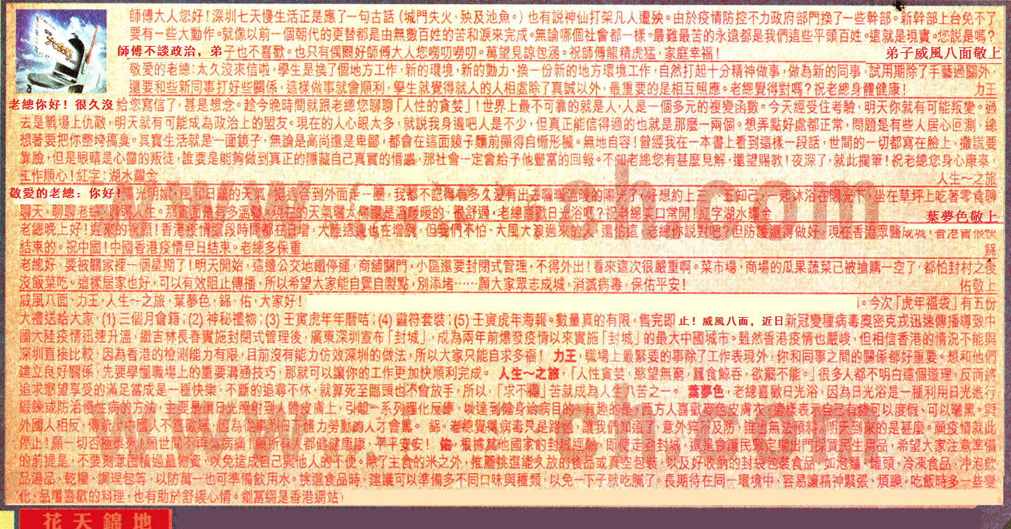 【5】. 老總晚上好!遲來的祝願!香港疫情這段時間都在日增,大陸這邊也在增例,但我們不怕,大風大浪過來的人,還怕這,老總你說對吧?但防護還得做好,現在香港眾醫成城,香港會很快結束的。祝中國!中國香港疫情早日結束。老總多保重 銱