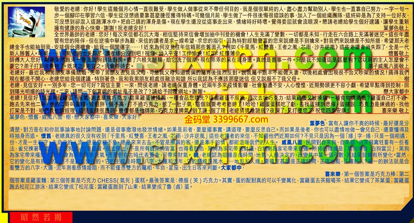 【2】.全世界最帥的老總: 您好!每次來信都石沉大海,相信堅持來信會增加抽中刊登的機會!人生充滿了變數,一切都是未知,行走在六台路上充滿著迷茫。這些年盡管有您的陪伴 ,但在逆境中舉步為艱 ,來信的讀者是求一線希望,求您的指引, 因為特對經驗豐富的您來說總是手到擒來。對我們來說總是不知所措,希望那天老總金手也能抽到我,安排個合適機會,給我一個開運字......近来為何沒見往年信箱那些舊面孔?例如《仟里馬,紅雙喜,王者之風,芯雨,沙井逆風》這些老讀者消失踪了,全是一代新人勝舊人......!可能老總也失踪了,讀者缘分沒到吧!祝您:出入平安!工作愉快!紅字:紅顏薄命 懷舊敬上