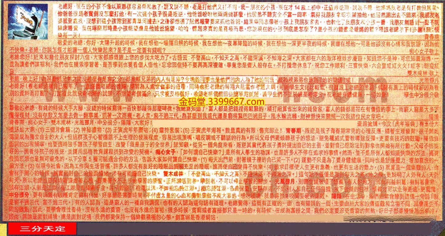 【3】.老想您好!近來和幾位朋友探討六信,大家都感慨跟上您的步伐太吃力了。古悟雲:不登高山,不知天之高,不臨深溪,不知海之深。大家都在六的海洋裡娃步漫遊。知道您不是神,可您知識淵博,一直為讀者們謀福利,我們也在摸索學習著,是否學到也要看個人悟性。忘您回信時不要再高深複雜,畢竟您是貴人般存在。不打攪您休息了,祝您工作順利,三寶快樂,六合皇紅紅火火!紅字:朝迎紅日 雙木成林 敬上