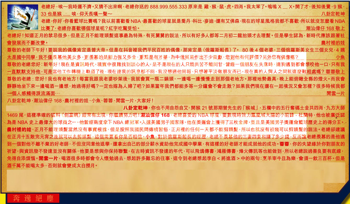 【1】.老總好,唉~我時運不濟。又猜不出來啊,老總你送的 888.999.555.333 原來是 雞,猴,鼠,虎。四肖。我太笨了。嗚嗚 X ﹏ X。開了才,後知後覺,9 猴,33 也是猴......唉,仰天長嘆一聲~ 八卦定乾坤