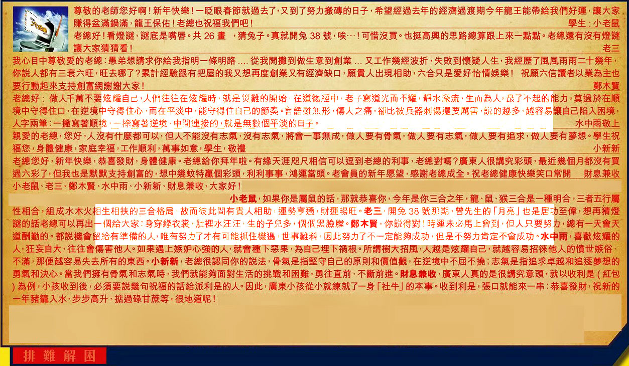 【6】.老總您好,新年快樂,恭喜發財,身體健康。老總給你拜年啦。有緣天涯咫尺相信可以逗到老總的利事,老總對嗎?廣東人很講究彩頭,最近幾個月都沒有買過六彩了,但我也是默默支持創富的,想中幾蚊特赢個彩頭,利利事事,鴻運當頭。老會員的新年愿望,感謝老總成全。祝老總健康快樂笑口常開 財息兼收
