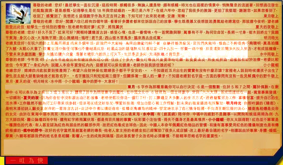 【4】.老總見信好!在玩六的路土風風雨雨走過來多個年頭,當我們中大彩時,高興的激動的睡不蓍,在夢裡都是偷笑,當我們失敗時恨自己不夠優秀不夠聰明,真是拍腫了大腿,太粗心大意了,現實生活中做任何事也不會輕易成功,輕易成功的話無成就感可言四十九挑一,想要一碼中特,那要需要前期多大投人努力,才有成就機會。不管未來多麼困難,學生永遠追随六合皇,跟普老總玩六的路上打天下。生活多姿多彩充满挑戰才有意思。 水中雨敬上