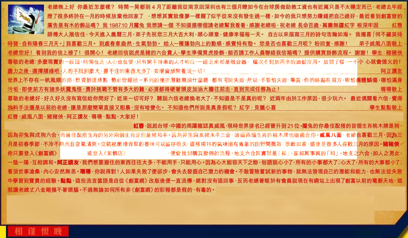 【6】.尊敬的老總好,好久好久沒有寫信給你問好了,近來一切可好?聽說六信老總換老大了,不知道是不是真的呢?近兩年由於工作原因,很少玩六。最近偶爾看六信,覺得放料手法還是以前的老總,還是那麼簡單直接又粗暴,沒有啥變化。不知道他們所說是真是假呢?紅字:見獵心喜 學生點點敬上