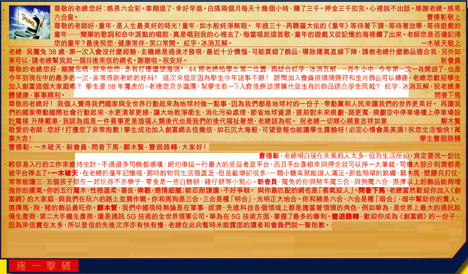 【4】.尊敬的老總您好,剛開完碼,就來信您,多有打擾還望海涵!!44 期老總給學生第二位置,再結合紅字:冰消瓦解,一肖牛小中,今年第一次一肖開胡了,也是今年到現在中的最多的一次,非常感謝老總的好料!這次來信是因為學生今年諸事不順!聽聞加入會員選購開運符和生肖飾品可以轉運,老總您歡迎學生加入創富這個大家庭嗎?學生是 98 年属虎的,老總您見多識廣,幫學生看一下入會後應該選購什麼生肖的飾品適合學生佩戴?紅字:冰消瓦解,祝老總身體健康,事事順利。  問香下馬