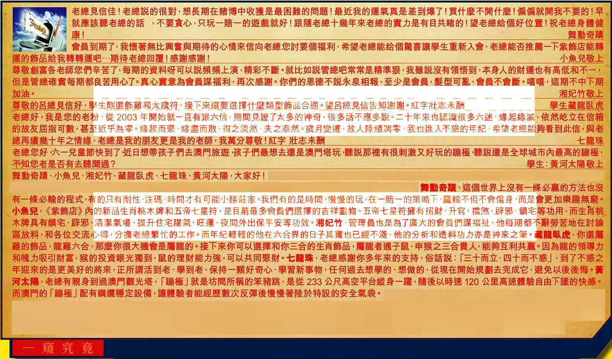 →〖湘妃竹〗:管理員也是為了廣大的會員們謀福祉,他每期都不辭勞苦地在討論區放料、和各位交流心得,分擔老總繁忙的工作。而年紀輕輕的他在六合界的日子其實也已經不淺,他的分析和透料功力亦是神來之筆。
