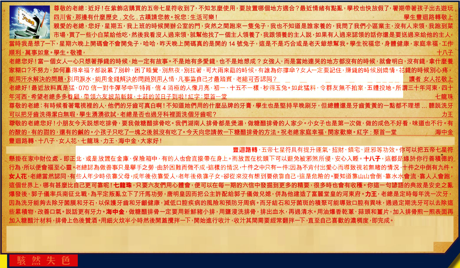 【4】.老總好!最近放料真是猛,070 信一對牛彈琴中平特肖,信 4 消極的人像月亮,初一、十五不一樣,秒得玉兔。如此猛料,令群友無不拍案,五體投地。所謂三十年河東,四十年河西,希望老總多多眷顧,帶領六友披荊斬棘,土莊的苦日子到啦!紅字:聚首一堂  七龍珠