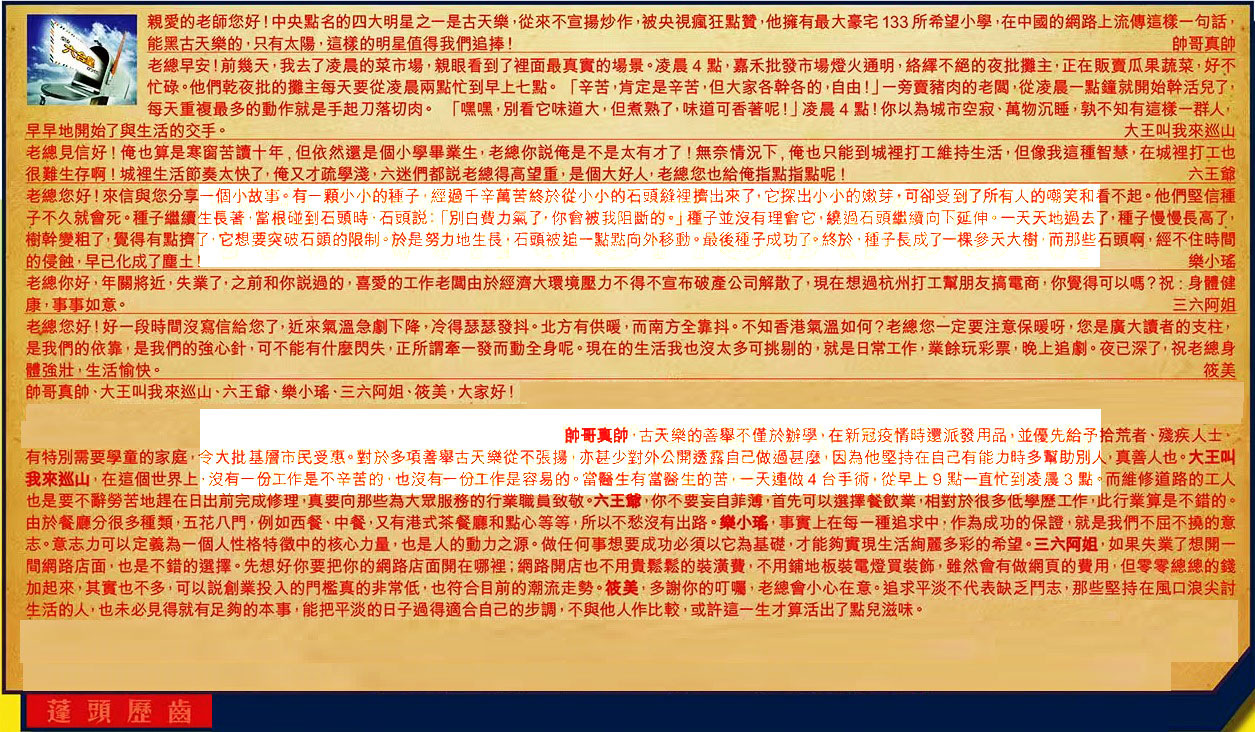 【6】.老總您好!好一段時間沒寫信給您了,近來氣溫急劇下降,冷得瑟瑟發抖。北方有供暖,而南方全靠抖。不知香港氣溫如何?老總您一定要注意保暖呀,您是廣大讀者的支柱,是我們的依靠,是我們的強心針,可不能有什麼閃失,正所謂牽一發而動全 身呢。現在的生活我也沒太多可挑剔的,就是日常工作,業餘玩彩票,晚上追劇。夜已深了,祝老總身體強壯,生活愉快。 筱美