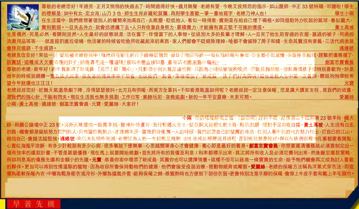 【4】.老總見信安好!來信一封,望能被老總你抽中!雖然現在學生的日子過得很艱難,但日子總還得過。一旦有點時間有事做,學生都不敢怠慢,爭取掙多點錢,趕緊把債務還了,說實話,這種成天欠著債務的目子,過得真不是一种滋制!祝福老吉祥如意,最後請老總來點小福利。 創富忠實會員