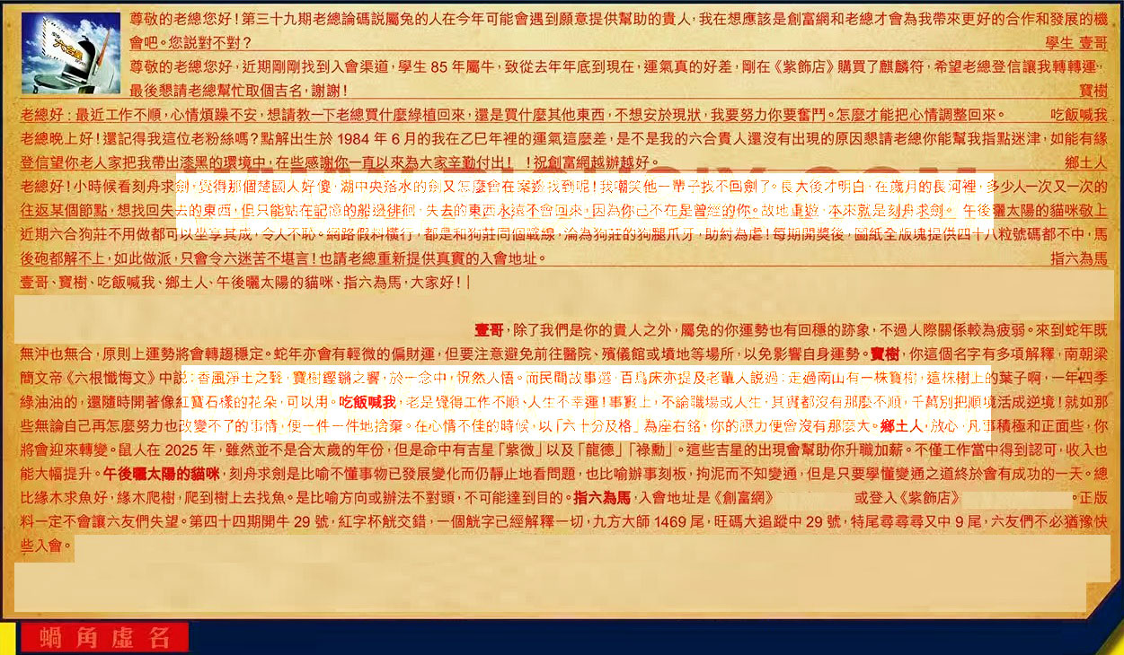 【1】.尊敬的老總您好!第三十九期老總論碼說屬兔的人在今年可能會遇到願意提供幫助的貴人,我在想應該是創富網和老總才會為我帶來更好的合作和發展的機會吧。您說對不對? 學生壹哥