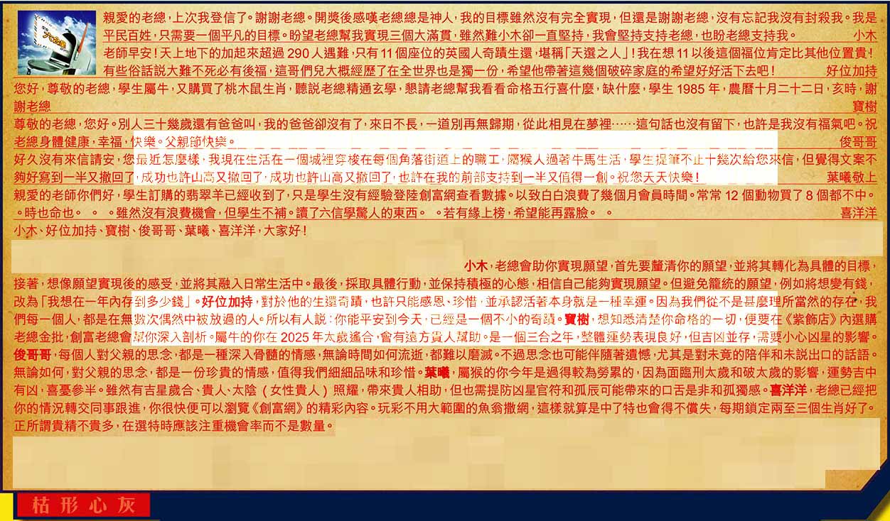 【6】.親愛的老師你們好,學生訂購的翡翠羊已經收到了,只是學生沒有經驗登陸創富網查看數據。以致白白浪費了幾個月會員時間。常常12個動物買了8個都不中。時也命也。。。雖然沒有浪費機會,但學生不補。讀了六信學驚人的東西。。若有緣上榜,希望能再露臉。。 喜洋洋