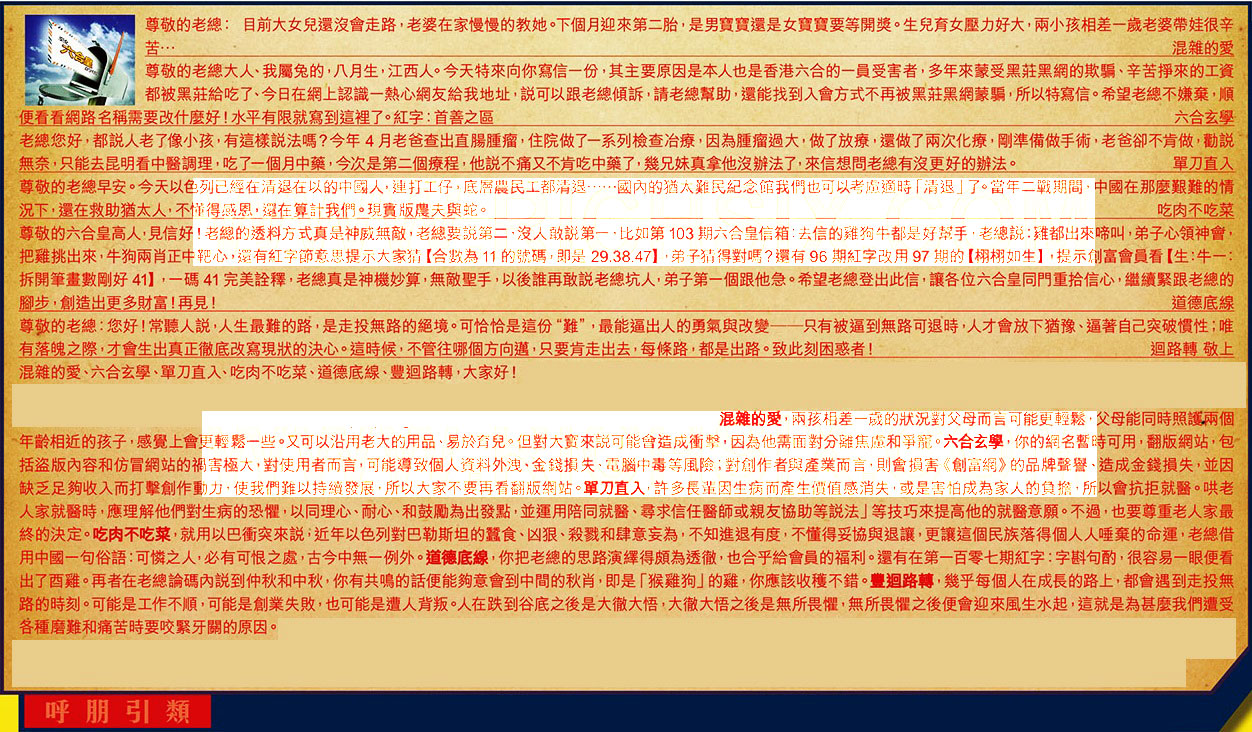 【2】.尊敬的老總大人、我屬兔的,八月生,江西人。今天特來向你寫信一份,其主要原因是本人也是香港六合的一員受害者,多年來蒙受黑莊黑網的欺騙、辛苦掙來的工資都被黑莊給吃了、今日在網上認識一熱心網友給我地址,說可以跟老總傾訴,請老總幫助,還能找到入會方式不再被黑莊黑網蒙騙,所以特寫信。希望老總不嫌棄,順便看看網路名稱需要改什麼好!水平有限就寫到這裡了。紅字:首善之區 六合玄學