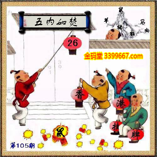 105期正版彩图挂:26爆:鼠 挂牌成语:五内如焚 挂牌出肖:羊猪猴鼠马狗