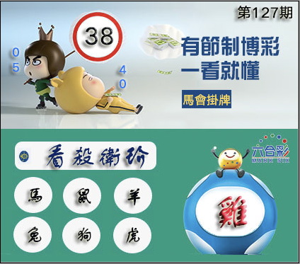 127期正版彩图挂:38 爆:鸡 挂牌成语:看杀卫玠 挂牌出肖:马鼠羊兔狗虎