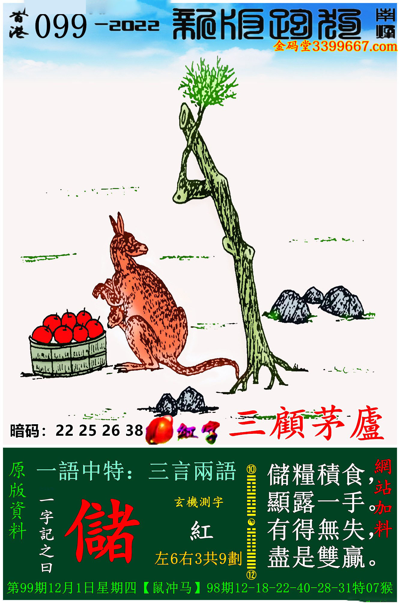099期:新版跑狗一字記之曰【儲】玄機測字:《紅》