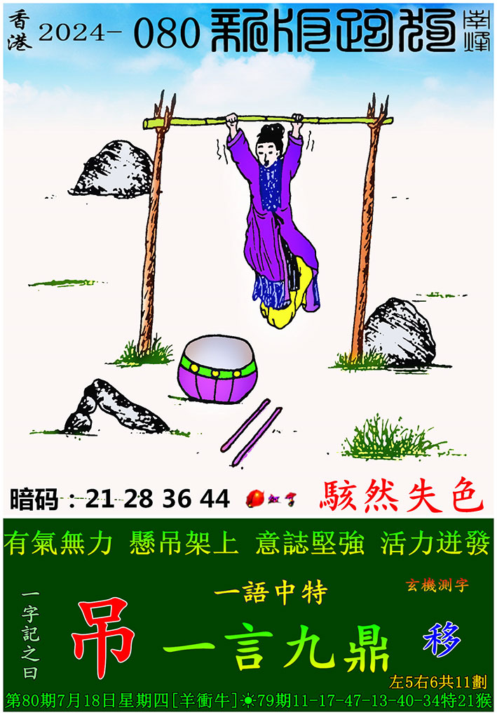 080期:新版跑狗一字記之曰【吊】 玄機測字:【移】
