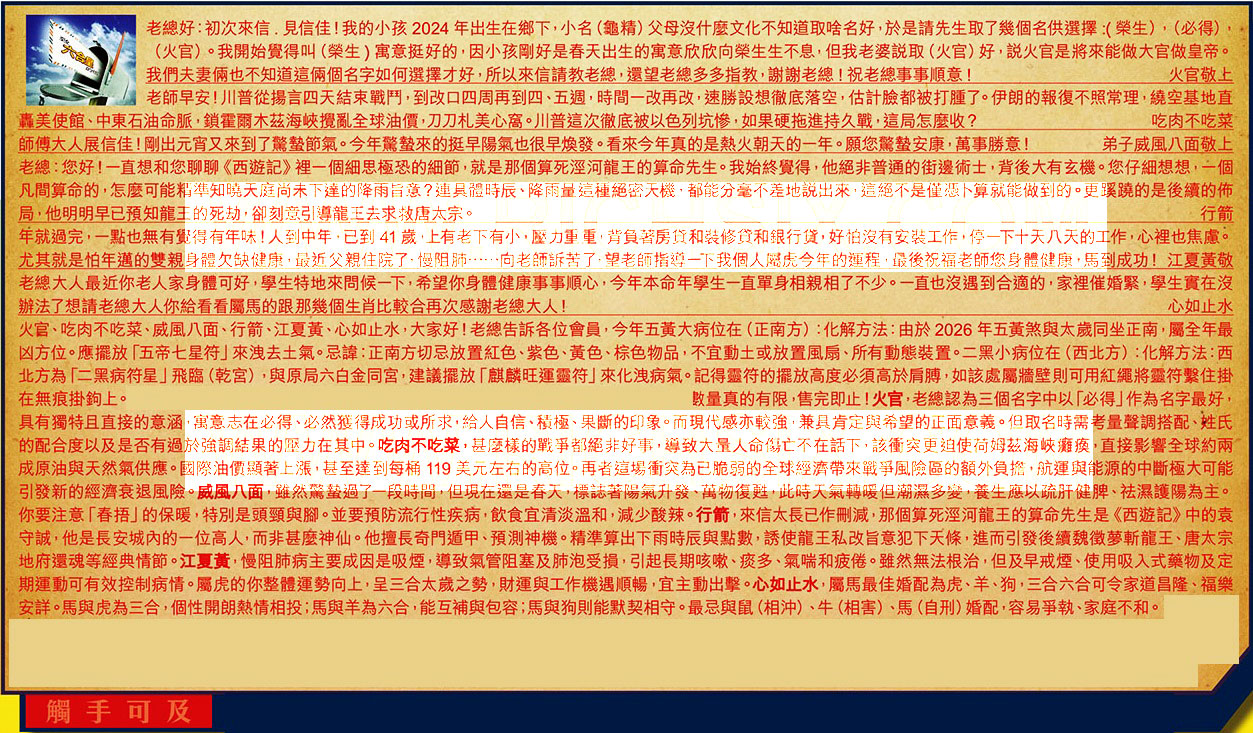 火官、吃肉不吃菜、威風八面、行箭、江夏黄、心如止水,大家好!老總告訴各位會員,今年五黄大病位在(正南方):化解方法:由於2026年五黄煞與太歲同坐正南,屬全年最凶方位。應擺放「五帝七星符」來洩去土氣。忌諱:正南方切忌放置紅色、紫色、黄色、棕色物品,不宜動土或放置風扇、所有動態装置、二黑小病位在(西北方):化解方法:西北方為「二黑病符星」飛臨(乾宮),與原局六白金同宮,建議擺放「麒麟旺運靈符」來化洩病氣。記得靈符的擺放高度必須高於肩膊,如該處屬牆壁則可用紅繩將靈符撃住繫在無痕掛鉤上。